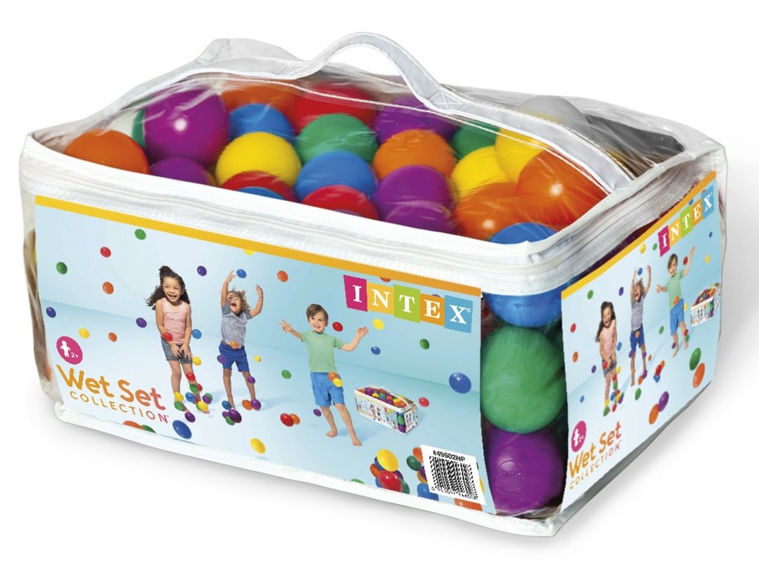 Intex 49602NP. Klaar voor een duik in de vrolijke ballenbak? Vul de ballenbak met deze 100 ballen van Intex en beleef veel speelplezier. Verpakt in een handige draagtas. Ook leuk voor in het zwembad! Afmeting per bal: Ø6,5cm diameter.
