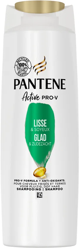 PANTENE PRO-V GLAD & ZIJDEZACHT SHAMPOO MET VOEDEND PRO-V COMPLEX:Voedt het haar met actieve Pro-V voedingsstoffen om het van binnenuit te versterken*. Geeft een zijdezachte glans en is ideaal voor gemakkelijk kroezend of droog haar.Pantene Glad & Zijdezacht shampoo:• Temt ruw en pluizig haar• Geeft je een mooie, zijdezachte coupe• Geeft je haar een perfect gehydrateerde look*versterken tegen stylingschade