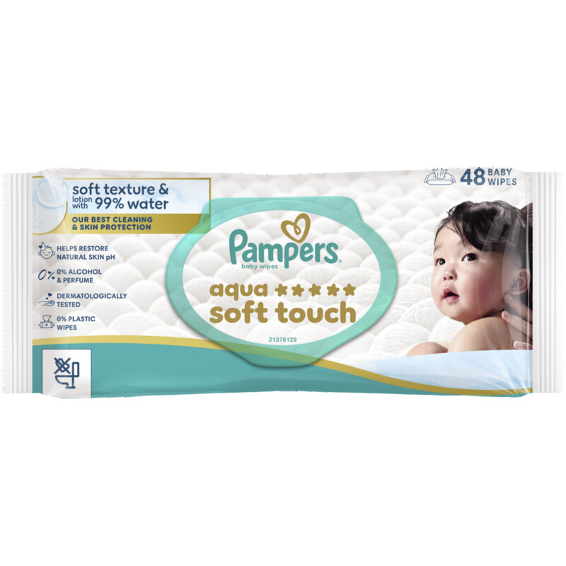 Pampers Aqua Soft Touch babydoekjes - de beste Pampers babydoekjes voor het reinigen en beschermen van de huid. Dankij hun zachte textuur en een lotion met 99% water zorgen onze doekjes voor een milde reiniging en helpen ze de gevoelige huid van je baby te beschermen. Hun speciale formule helpt de natuurlijke pH-waarde van de huid herstellen en ze te beschermen tegen roodheid. Ze zijn gemaakt met 0% alcohol en parfum. De formule is dermatologisch getest en goedgekeurd door de dermatologen van de Skin Health Alliance.