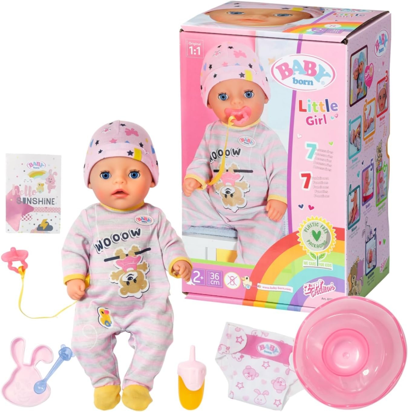 BABY born Little Girl (36 cm) met speelpakje en muts. Inclusief 1 potje, 1 stoffen luier, 1 flesje, 1 bord met lepel, 1 speentje en 1 geboortebewijs.