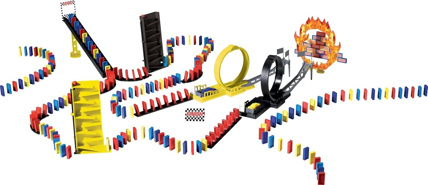 De Domino Express Crazy Race Set zorgt met zijn coole hindernissen en loopings voor actie! Het parcours begint met een lanceerplatform. De dominstenen vallen een voor een van de helling af. Met de dominostenen kun je de auto's in gang zetten, die vervolgens door een looping schieten en via het platform door een brandende ring vliegen!