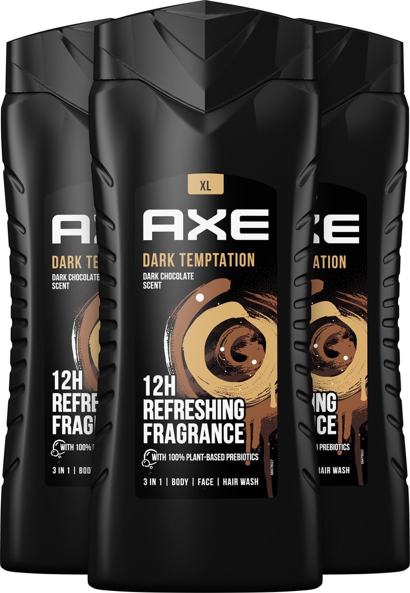 AXE Dark Temptation 3-in-1 Douchegel zorgt voor een verfrissende en relaxte verzorging en reiniging van je lichaam, gezicht en haar en laat je tot 12 uur onweerstaanbaar ruiken. AXE Dark Temptation Douchegel met de geur van donkere chocolade en een vleugje kruiden bevat 100% plantaardige moisturizers en is dermatologisch getest.