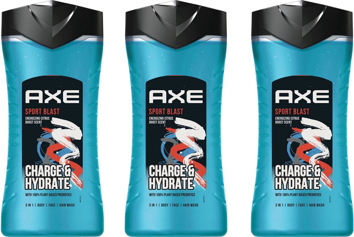 - AXE Sport Blast 250 ml 3 in 1 is geschikt om je lichaam, gezicht en haar mee te wassen.
