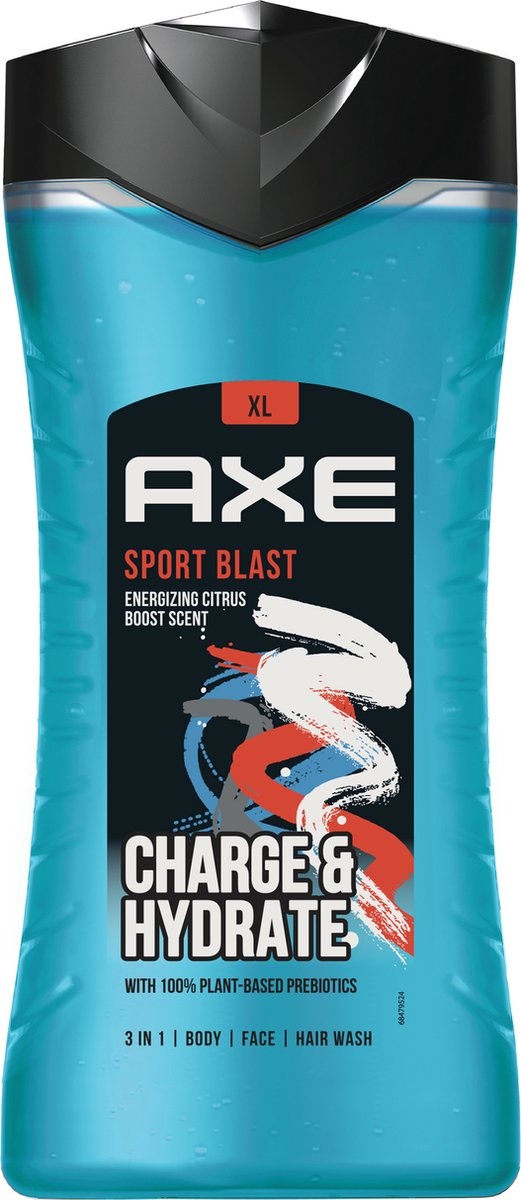 - AXE Sport Blast 250 ml 3 in 1 is geschikt om je lichaam, gezicht en haar mee te wassen.