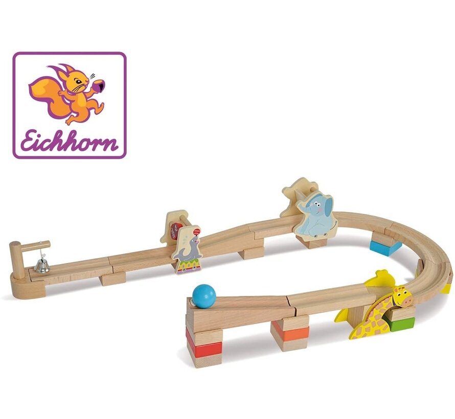 Maak met deze 30-delige houten Eichhorn set een Knikkerbaan. Geef een duw tegen de grote blauwe knikker en zie hoe hij over de baan rolt. Aan het einde botst de knikker tegen een belletje waarna je een geluidje hoort. Dat is leuk! Onderweg komt de knikker diverse dieren tegen zoals een giraffe, een olifant en een zeehond. Geschikt vanaf 3 jaar.