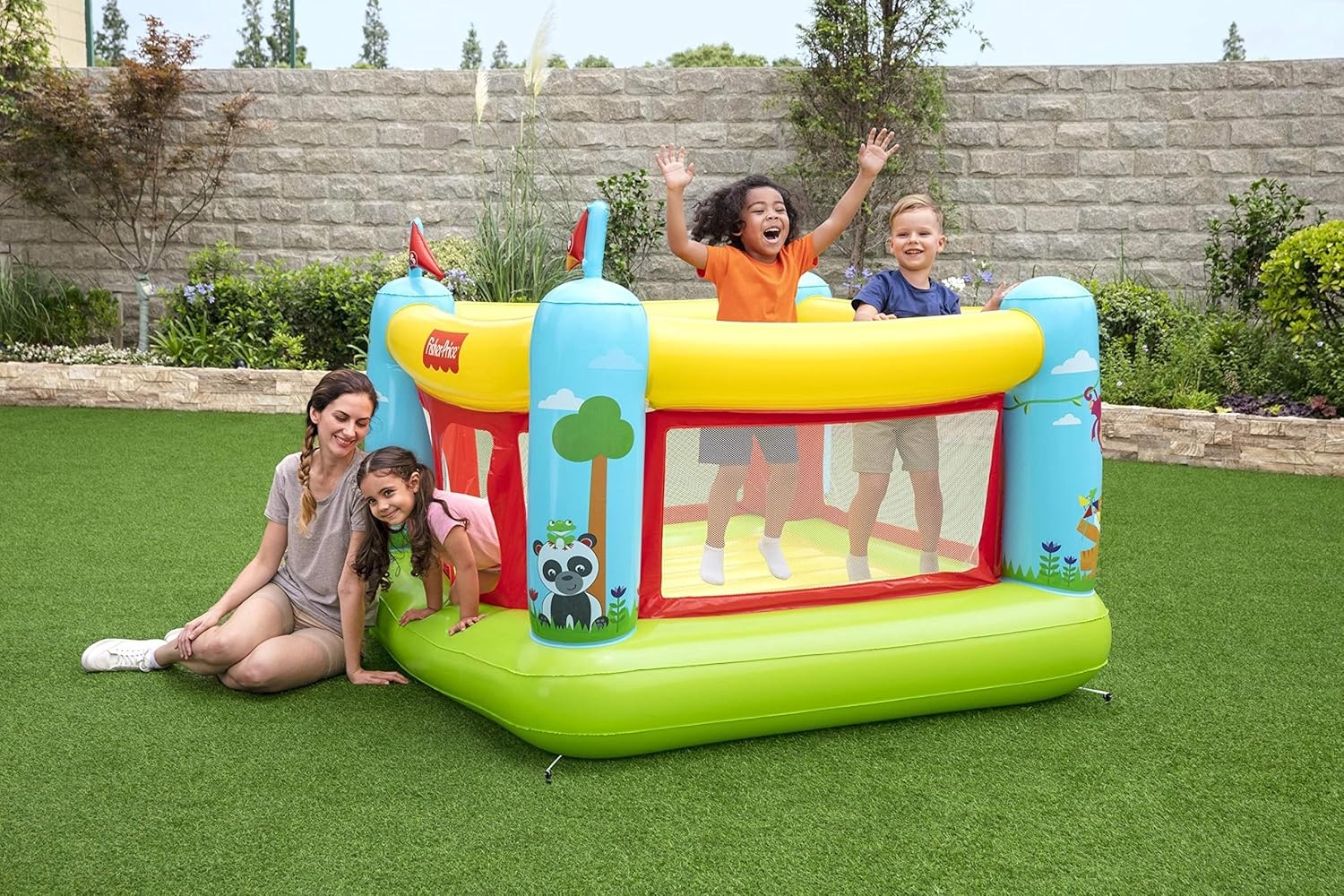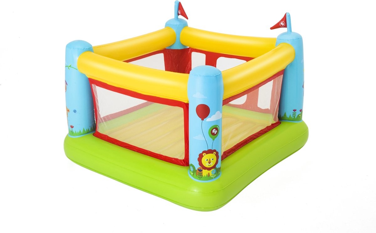 Vrolijk opblaasbaar springkussen van Fisher Price voor de kleintjes. In vrolijke kleuren en met dierenafbeeldingen op de zijstutten. Netwanden voor beter toezicht en veiligheid. Kleine ingang waar je door heen moet kruipen. Zowel voor gebruik in- als outdoor. Incl. reparatie patch. Max. gewicht: 85 kg. Leeftijd: 3+. Afmeting: 175x173x135 cm.
