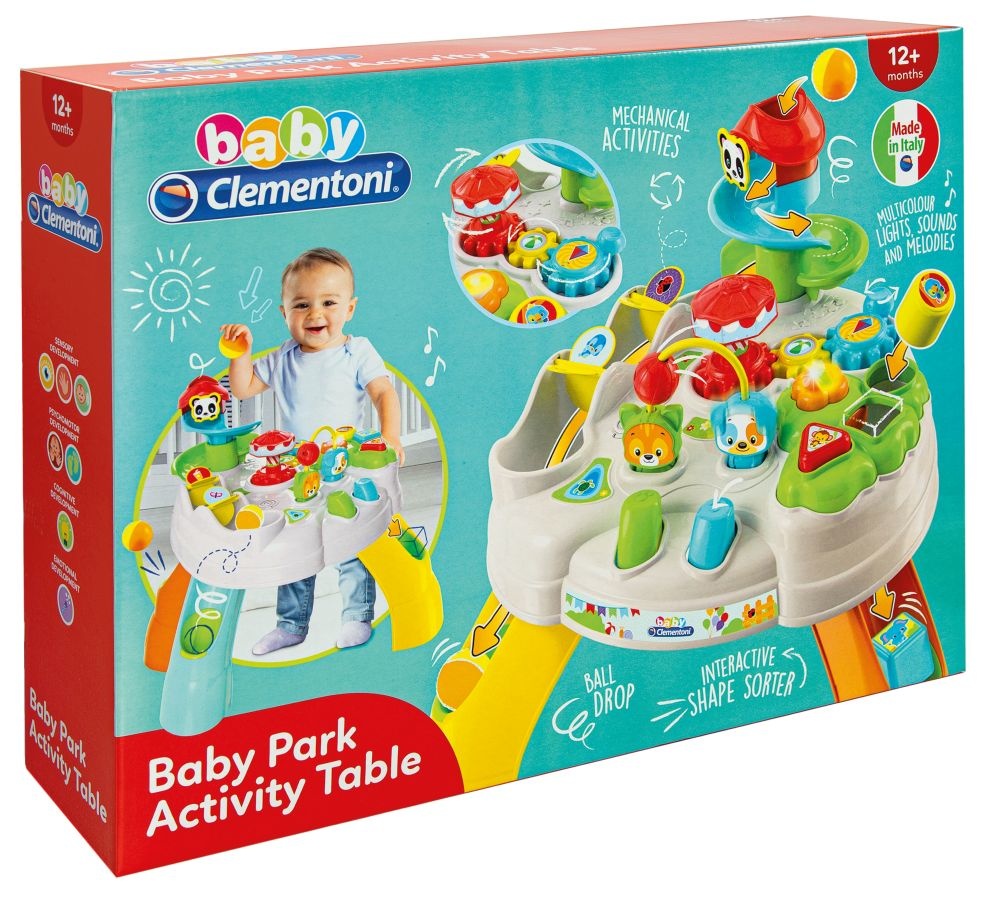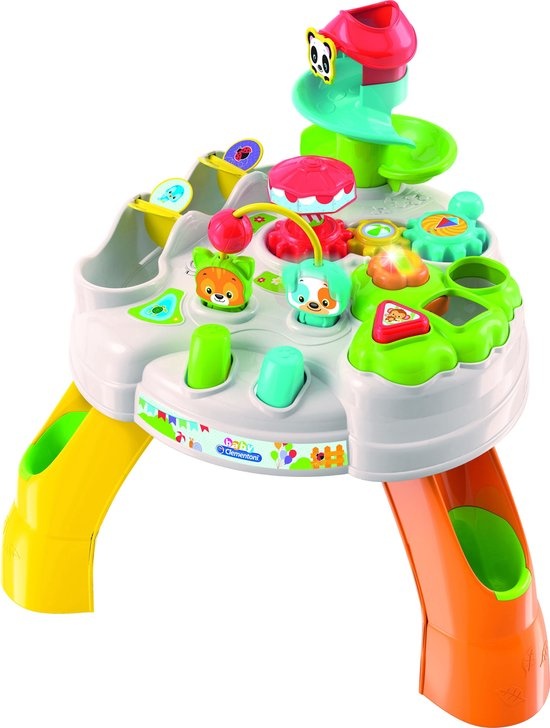 Een rijke interactieve elektronische activiteitentafel die zich afspeelt in de leuke wereld van pretparken. Bevat veel activiteiten: het vormgebied is interactief met lichten en geluiden, de tandwielen draaien en de karakters bewegen wanneer de knoppen worden ingedrukt. Bevat een leuke route met ballen en glijbanen die eindigt in de voeten van de tafel. Stimuleert handmatige vaardigheden, visuele perceptie en herkenning van de oorzaak-gevolg relatie.
