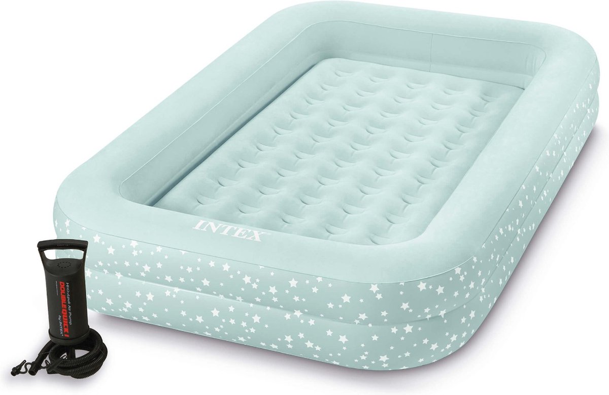 Dit Intex 66810 kinderluchtbed (camping bedje / logeerbed) is een ideale slaapoplossing tijdens een (kampeer)vakantie of wanneer er iemand komt logeren. Het luchtbed weegt slechts 4 KG en wordt geleverd met een handpomp en een draagtas. De afmeting van dit matras (binnen de opstaande rand) is ca. 132cm lang, 71cm breed en 10cm hoog en is geschikt voor kinderen van circa 3 tot 6 jaar. De afmeting van de buitenkant is 168cm breed x 107cm lang x 25cm hoog. Het losse bodem matras is tevens er uit te halen en dan is de opstaande rand nog hoger. Vanwege de opstaande rand is de buitenafmeting groter. Gemaakt van duurzaam en sterk 0,53mm dik vinyl.