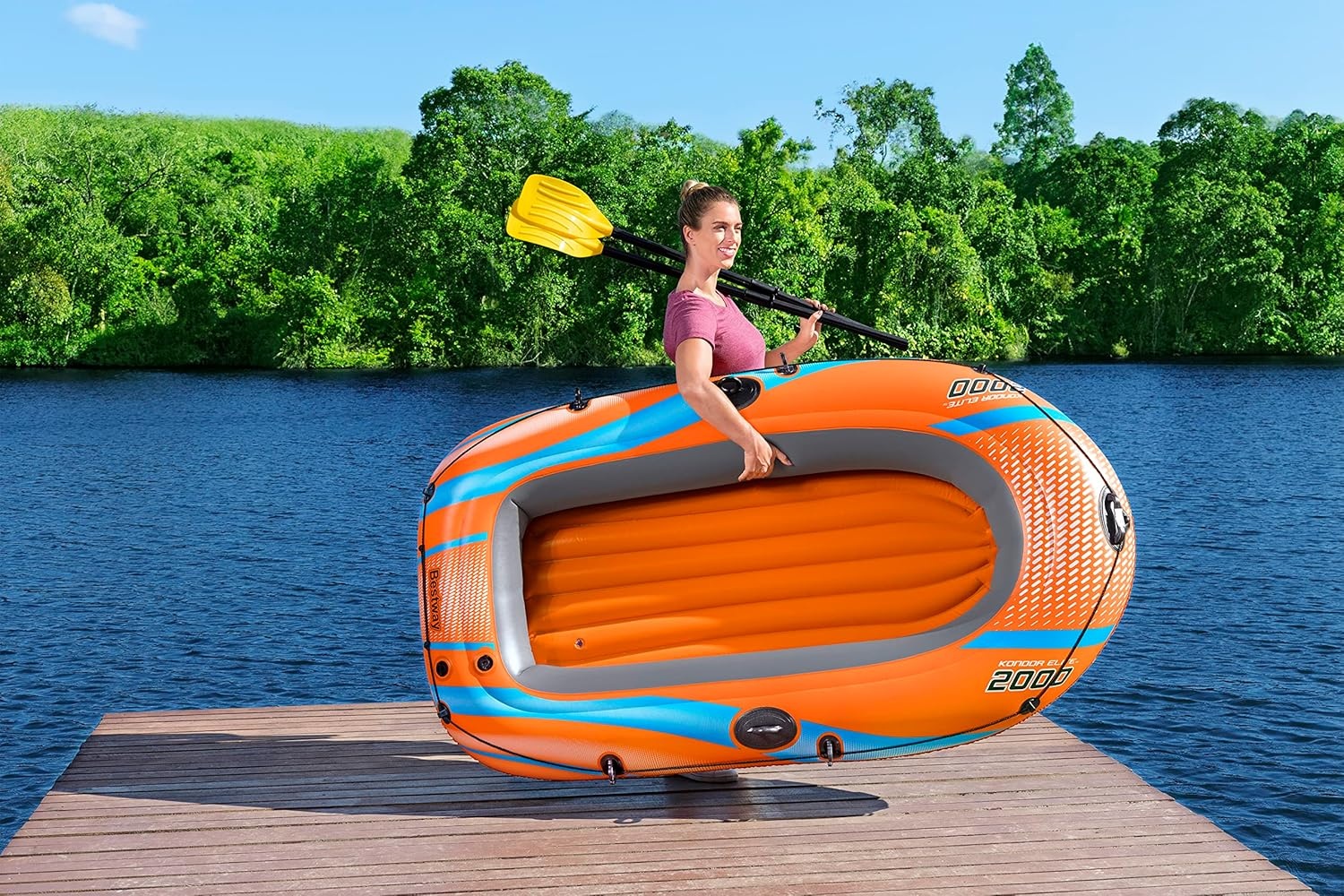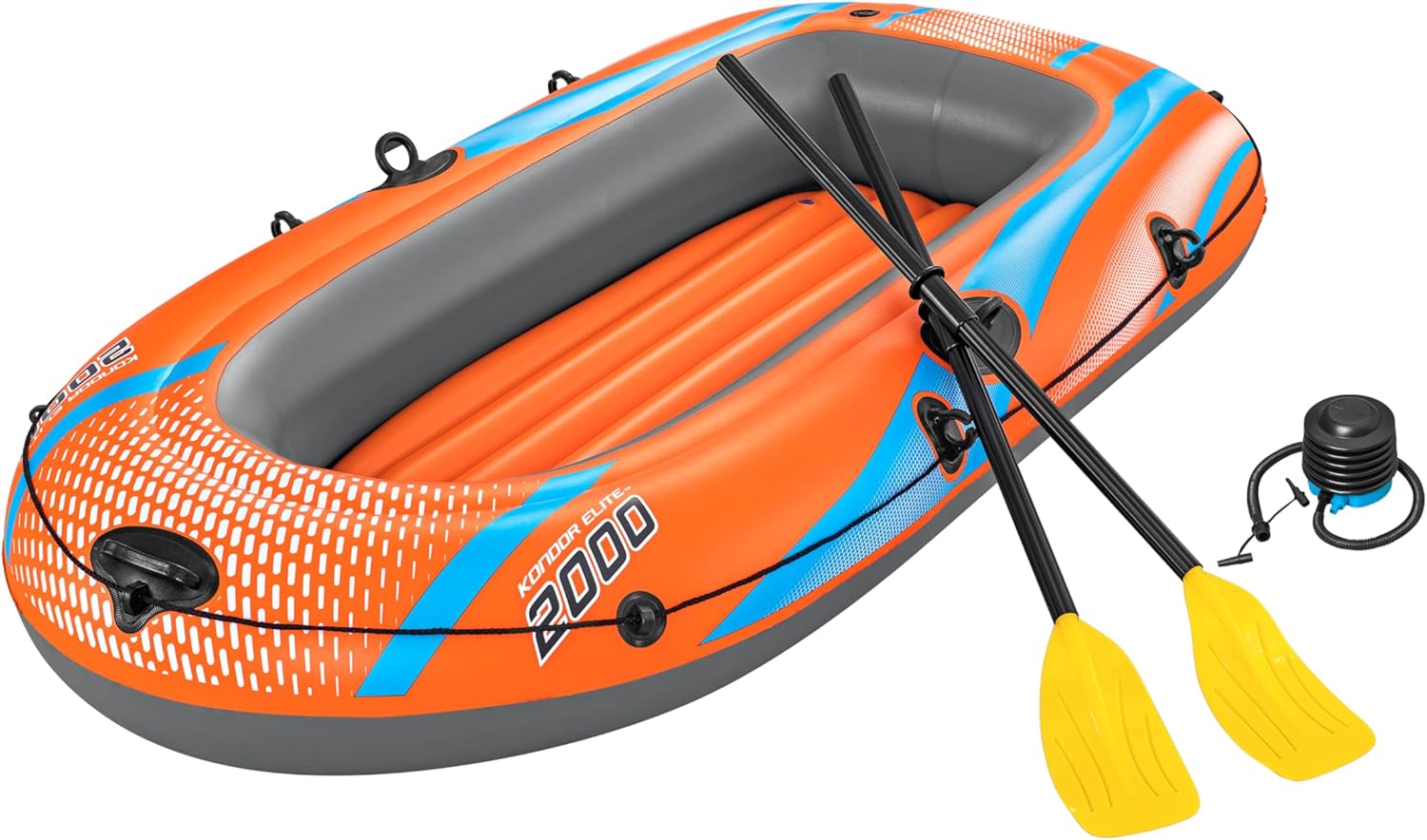 De Bestway Kondor Elite 2000 Set is een opblaasbare boot met stevige roeidollen, roeispaanklemmen en een dubbele luchtkamer voor stabiliteit. Het omringende veiligheidstouw met ingebouwde touwgaten maakt het mogelijk om accessoires zoals een ankertouw of reddingsboei veilig te bevestigen, maar ook om vanuit het water makkelijk in de boot te klimmen.