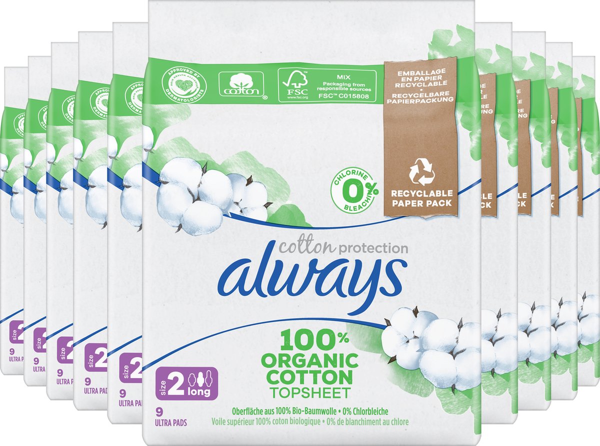Always Cotton Protection maandverband zorgt voor jou en het milieu met een toplaag van 100% biologisch katoen in een recyclebare papieren verpakking. Het maandverband bevat geen parfum, geen kleurstoffen en geen chloorbleekmiddelen. Het maandverband is goedgekeurd door dermatologen van SHA (Skin Health Alliance) en gecertificeerd door Cotton Inc. Het katoenen maandverband heeft een ultra absorberende kern dat vocht omzet in gel om je de vertrouwde Always bescherming te bieden. Always Cotton Protection Long is ideaal voor een lichte menstruatie met lingeriemaat L, voor een gemiddelde menstruatie met lingeriemaat M en L, of voor een zware menstruatie met lingeriemaat S.