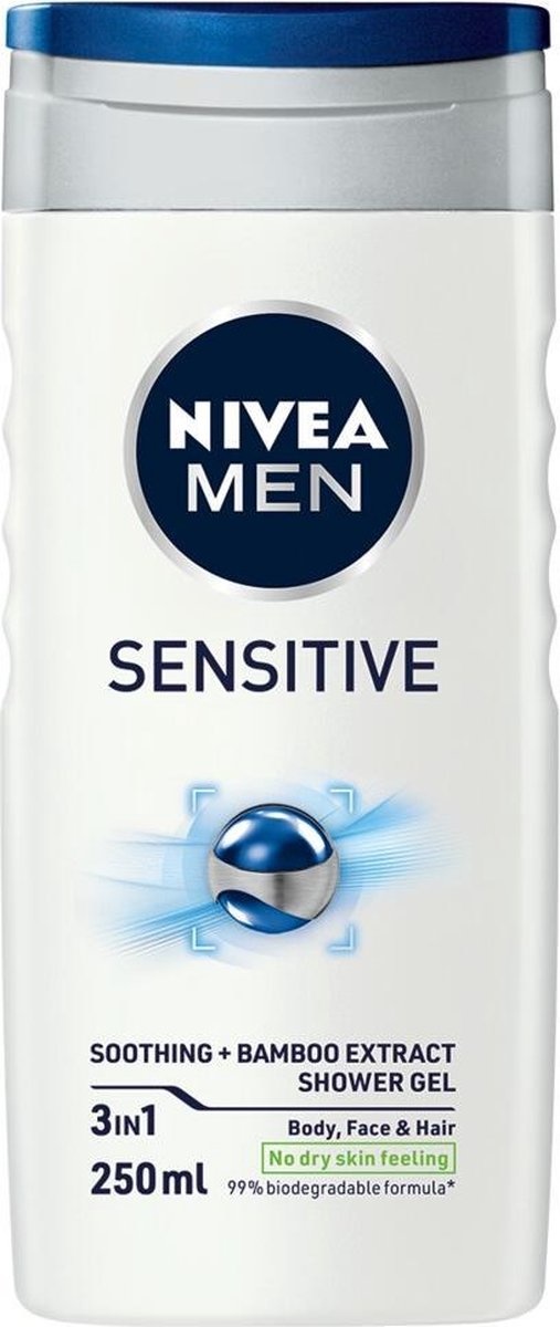 NIVEA MEN Sensitive Douchegel. VOOR MANNEN die een verzachtende douche willen met een intensieve verzorging van de gevoelige huid. De 3-in-1 douchegel voor lichaam, gezicht en haar is de beste manier om je huid te verzachten. Voor een voelbaar zachte huid na elke douche. De formule is 99% biologisch afbreekbaar * en de fles is gemaakt van tot wel 97% gerecycled materiaal **