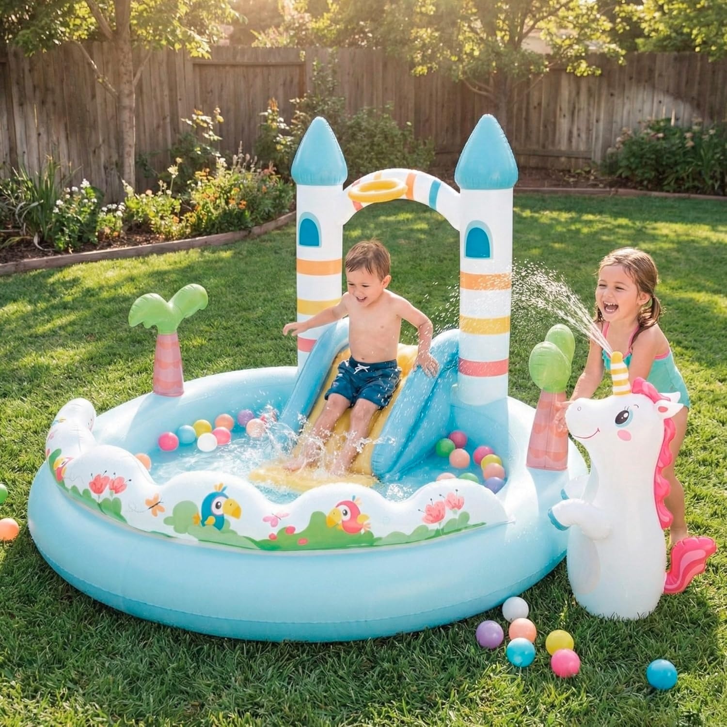 Het speelzwembad is uitgerust met een glijbaan met zachte landingsmat, een eenhoorn-bopzak om tegenaan te stoten en een balgooispel met 8 bijgeleverde ballen. Zo kunnen kinderen niet alleen spetteren, maar ook klimmen, mikken en bewegen. De ingebouwde sproeier sluit je eenvoudig aan op de tuinslang en zorgt voor extra verkoeling tijdens het spelen.