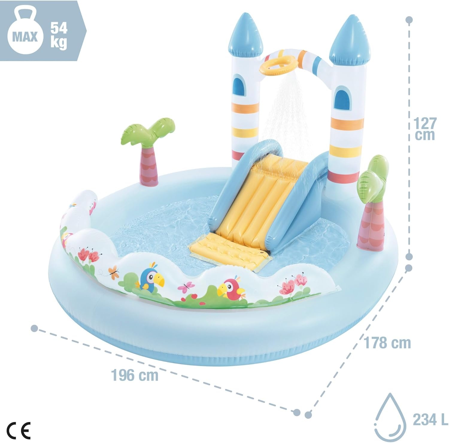 Met een watercapaciteit van 234 liter bij 17 cm wandhoogte is dit play center perfect afgestemd op jonge kinderen. De lage rand maakt instappen makkelijk en veilig, terwijl het stevige materiaal zorgt voor stabiliteit tijdens het spelen. Dankzij het compacte maar doordachte ontwerp past het speelzwembad in vrijwel elke tuin.