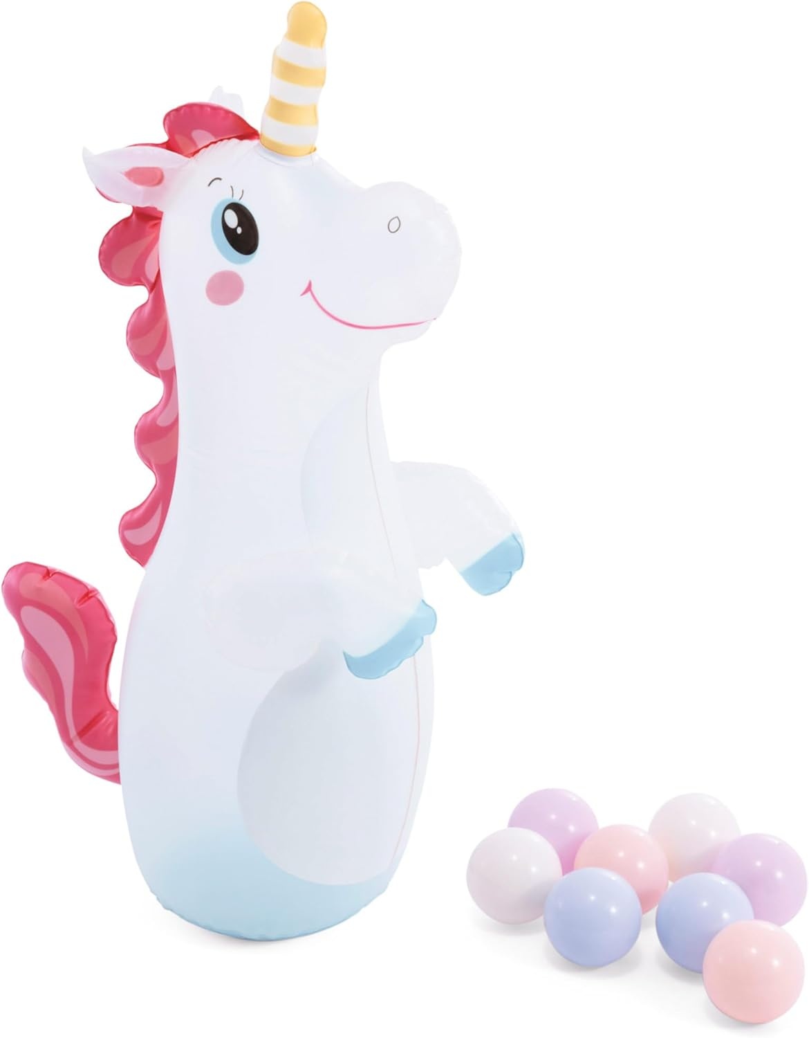 - Speelelementen: glijbaan, eenhoorn-bopzak, balgooispel + 8 ballen