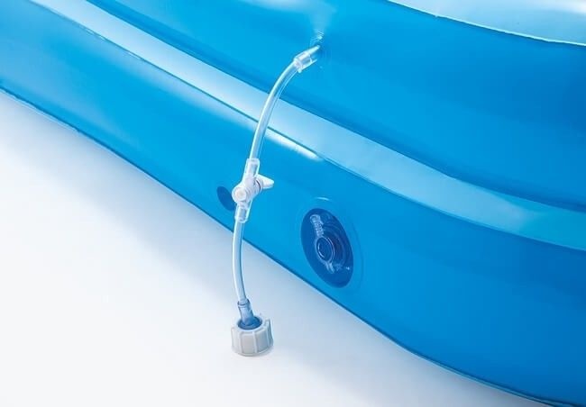 Het zwembad speelcentrum heeft een afmeting 257cm x 216cm x 84cm. De wanden van het grote bad zijn 20cm hoog en het badje kan gevuld worden met 493 Liter water. Het kleine badje met 57 Liter. Het opblaaszwembad is voorzien van een afvoerplug waardoor het water na gebruik makkelijk en snel weg kan lopen. Het speelzwembad is gemaakt van hoge kwaliteit vinyl en kan spelende kinderen gemakkelijk aan. Er wordt bovendien een stukje reparatiemateriaal geleverd wanneer er onverhoopt toch een lekje ontstaat dan is het hiermee eenvoudig te plakken. Het Jungle Adventure speelcentrum is geschikt voor kinderen vanaf 3 jaar.