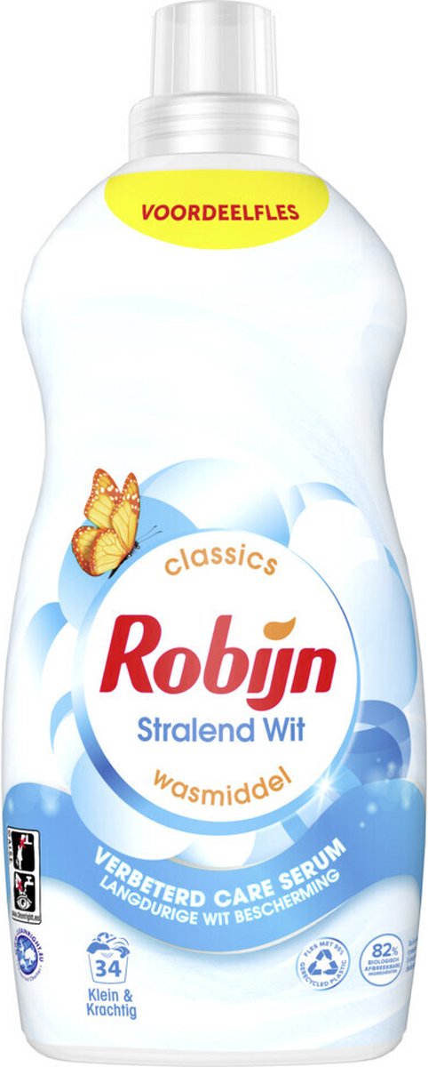 Robijn Klein & Krachtig Classics Stralend Wit Vloeibaar Wasmiddel bevat 82% biologisch afbreekbare ingrediënten en is speciaal ontwikkeld voor de lichte en witte was.